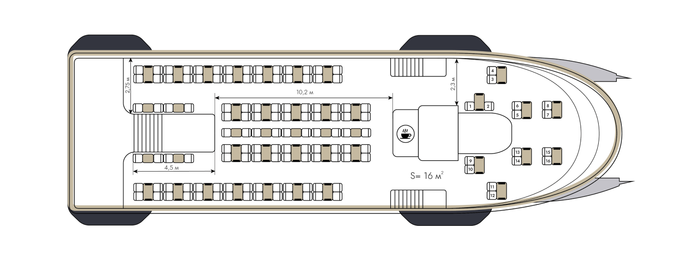 Рассчитан на 130 пассажиров. Главная палуба оборудована мягкими стульями и столами с рассадкой по 2 и 4 человека. В носовой части находится салон повышенной комфортности с панорамными окнами на 16 мест. Помещения имеют хорошую звукоизоляцию, оборудованы сплит-системой. Верхняя палуба открытая, но защищена от осадков прозрачной крышей для прогулок на свежем речном воздухе.